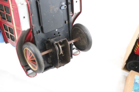 3 Tin Litho Friction Battery Toy Cars & Tractor - TN Japan Tin Battery Operated Grandpa Car, Tin Friction Jalopy and Wind Up Tin Litho Tractor in Box. Lot Size 11" x 11" x 7". 3 Lbs. Photos are part of description (Live Auctioneers only displays a max of 20 photos -check other platforms for all photos). Please ask questions and read terms & conditions before bidding.