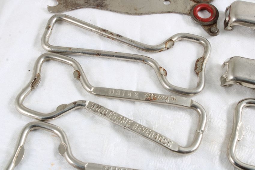 20 Soda and Other Advertising Bottle Openers - Hires Root Beer, Barq's Root Beer, Squirt, Nesbitt, Pepsi Cola, Canada Dry, Niagara Ginger Ale, Schweppes, Combination Glass Cutter, Bottle Opener and Knife Sharpener. Lot Size 6" x 4" x 2". 1 Lb. Photos are part of description (Live Auctioneers only displays a max of 20 photos -check other platforms for all photos). Please ask questions and read terms & conditions before bidding.