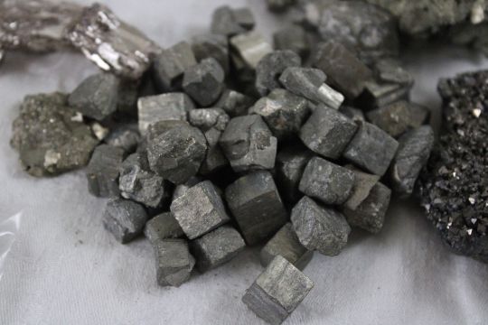 Assortment of Geological Minerals & Specimens - Fuchsite, Iron Pyrite, Raw Pyrite Crystals, 99.99% Pure Bismuth, Rough Tanzanite Iolite. Lot Size 8" x 6" x 4". 4 Lbs. Photos are part of description (Live Auctioneers only displays a max of 20 photos -check other platforms for all photos). Please ask questions and read terms & conditions before bidding.
