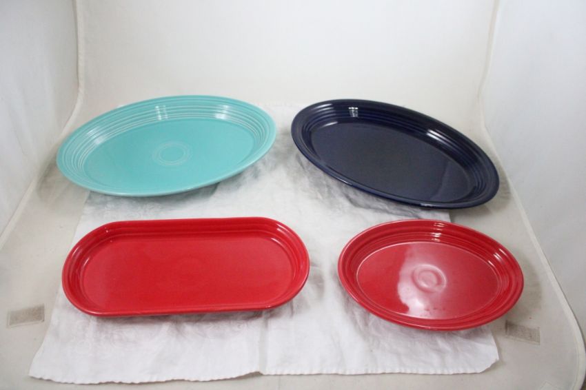 4 Fiesta HLC Serving Platters - 13.5" Turquoise Platter, 13.5" Cobalt Platter, 12" Scarlet Oblong Platter, 9.5" Scarlet Oval Platter. Lot Size 14" x 10" x 8". 8 Lbs. Photos are part of description (Live Auctioneers only displays a max of 20 photos -check other platforms for all photos). Please ask questions and read terms & conditions before bidding.