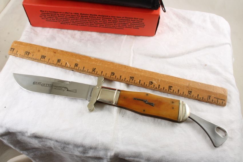 Marbles Game Getter Folding Knife in Case & Box - Lot Size 8" x 4" x 2". 1 Lb. Photos are part of description (Live Auctioneers only displays a max of 20 photos -check other platforms for all photos). Please ask questions and read terms & conditions before bidding.
