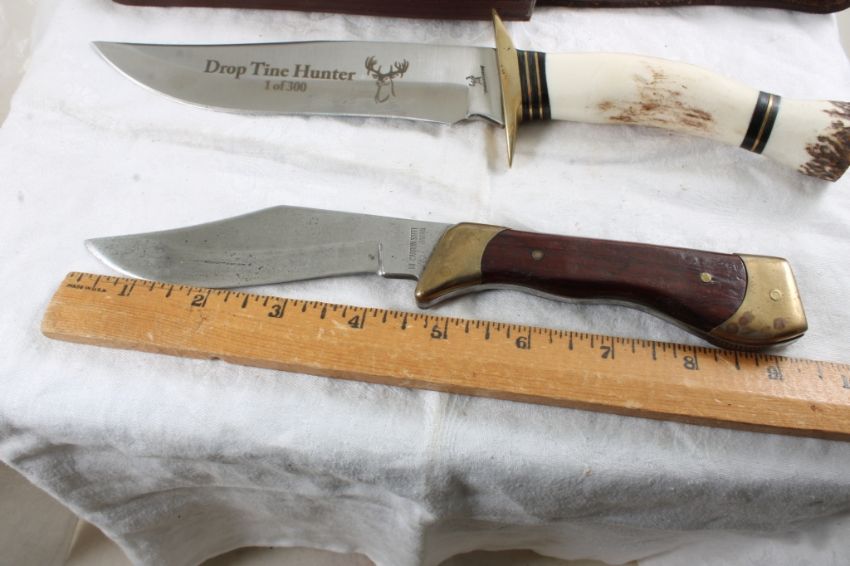 2 Fixed Blade Knives Drop Tine Hunter Ltd. Ed. - with sheath and High Carbon Steel #2651. Lot Size 12" x 3" x 3". 2 Lbs. Photos are part of description (Live Auctioneers only displays a max of 20 photos -check other platforms for all photos). Please ask questions and read terms & conditions before bidding.
