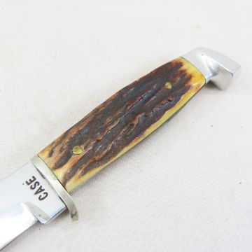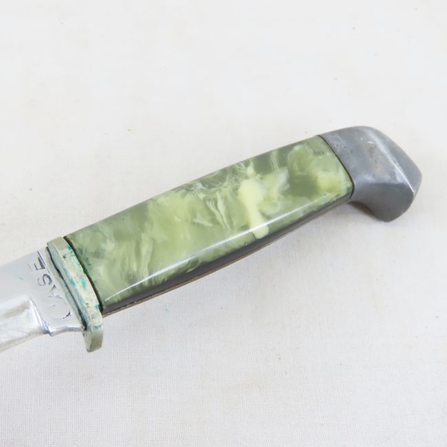 2 Antique 1930's Case Fixed Blade Knives - Stag handle with fixed 5" blade is 9" OAL with Case sheath. And green pearl handle with 4.25" fixed blade is 8" OAL in unmarked sheath. Both have been sharpened. LOT SIZE: 10x5x5", 1 lb All information and photos are intended to be as accurate as possible, but errors are possible. No item may be returned or refused based on this information, which is provided as a service to bidders. Please read terms & conditions and ask questions before bidding.