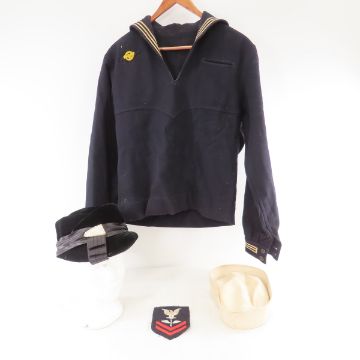 WWII Era US Navy "Crackerjack" Jumper & Hat - Crackerjack Jumper and Dixie Cup Hat, Black Velvet Cloche Hat and Military Patch. Lot Size: 12 x 10 x 10", 2 lbs All information and photos are intended to be as accurate as possible, but errors are possible. No item may be returned or refused based on this information, which is provided as a service to bidders. Please read terms & conditions and ask questions before bidding.