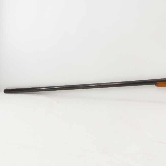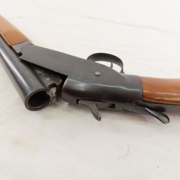 Long Tom 12 GA Top Break Shotgun - NVSN on receiver, 40.5" Genuine armory steel choke barrel marked 87111, plain wood forearm marked 167 (not original), checkered wood pistol grip stock has crack from top tang towards butt. Leather butt bad. Primarilymade by Crescent Arms between 1908-1916, though later models were produced by other manufacturers like Stevens. Good condition for age. C&R or FFL transfer required. Please know local laws before bidding. Lot size:41x8x3", 8 lbs All information and photos are intended to be as accurate as possible, but errors are possible. No item may be returned or refused based on this information, which is provided as a service to bidders. Please read terms & conditions and ask questions before bidding.